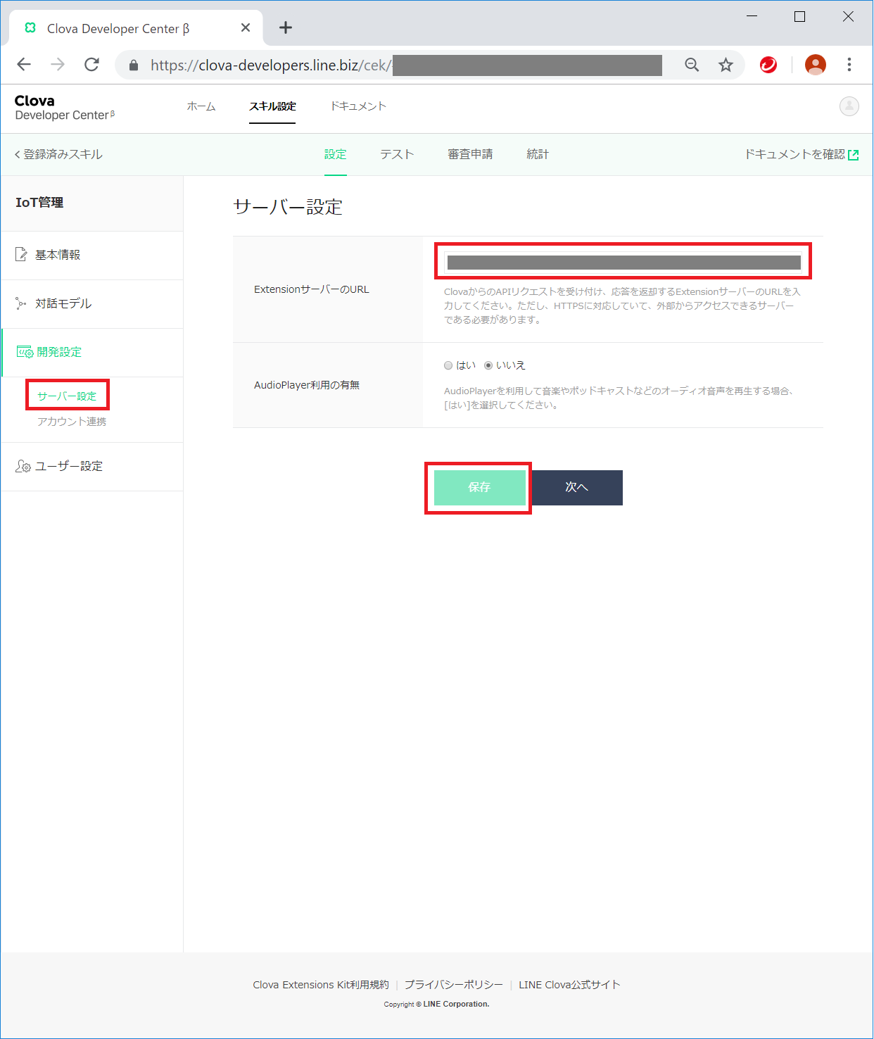 API GatewayのPOSTメソッドの定義する際に、必ず「Lambda プロキシ統合の使用」の使用にチェックして、定義して下さい。 定義したメソッドをデプロイして、Clova Developer Centerの「ExtensionサーバのURL」に、エンドポイントを設定します。